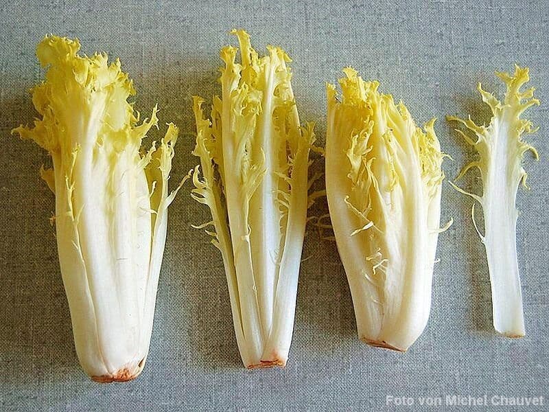 Dieser wird zwar meist zu den Salaten gezählt, aber es handelt sich eigentlich um den Wurzelspross der Wegwarte (Zichorie).