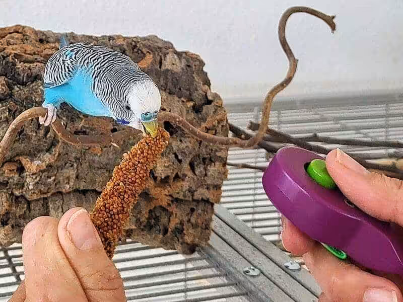 Beim Clickertraining wird ein gewünschtes Verhalten des Wellensittichs durch ein Klickgeräusch bestätigt und mit Leckerlis belohnt.