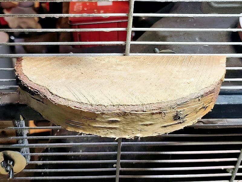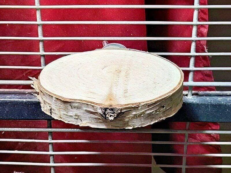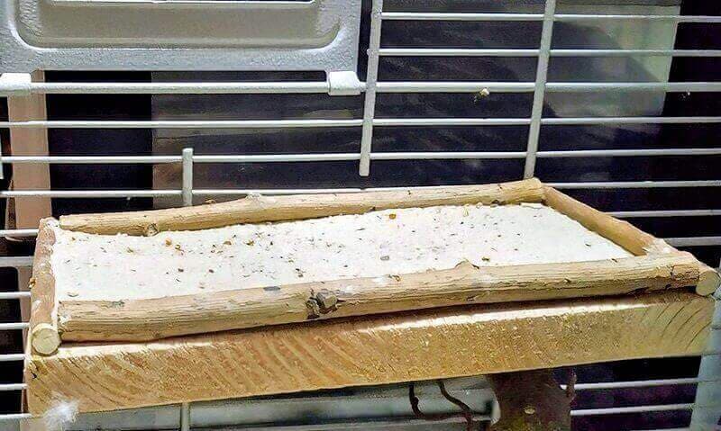 Das Sitzbrett mit Naturholzumrandung benutze ich als „Sandbad“. Ich habe dieses auch unterhalb einer der seitlichen Käfigtüren angebracht, um besser den Vogelsand reinigen bzw. ersetzen zu können.
