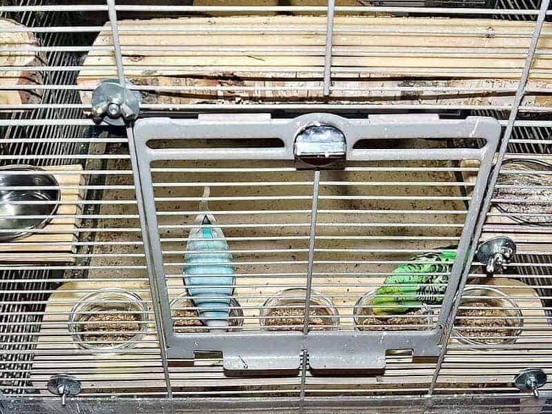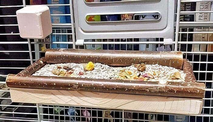 Die Futterbar mit den Glasschälchen und der Wassernapf befinden sich natürlich vorn unterhalb der Käfigtür, damit diese gut zugänglich sind.