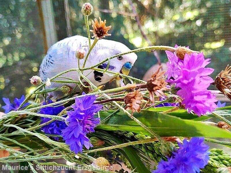 Wellensittich knabbert an Kornblumen