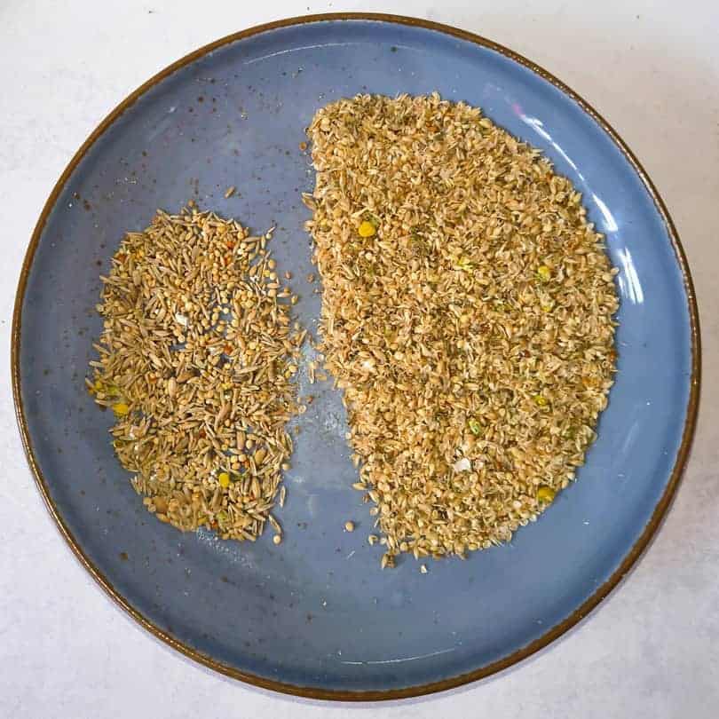 Auf meine Rückfrage hin wurde mir ein Grassamenanteil von 11 % genannt, der somit zwar geringer als in den anderen Mischungen ausfällt, aber immer noch vollkommen ausreichend ist.