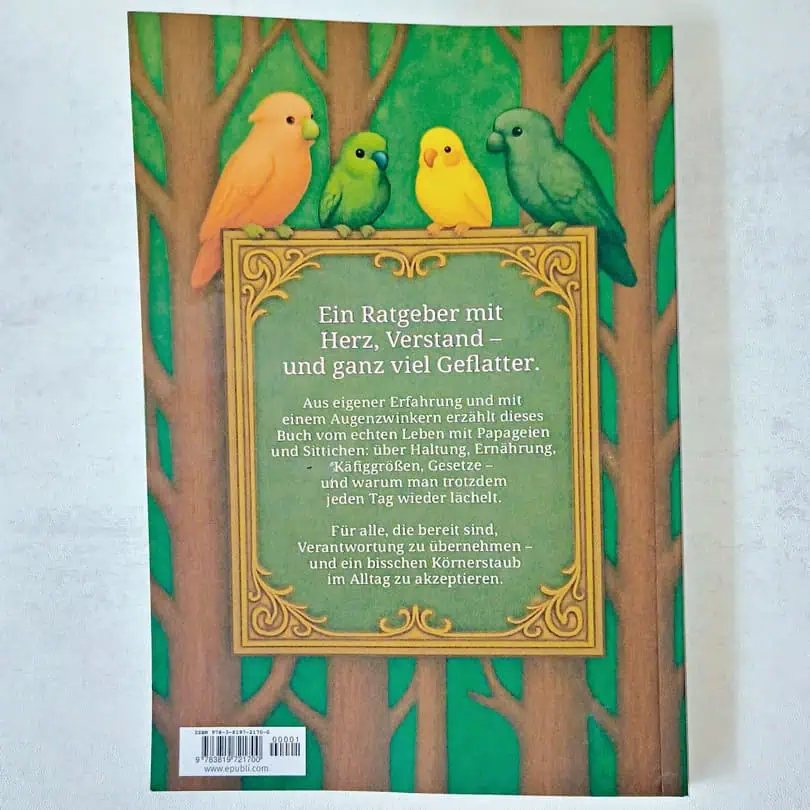 Das Buch ist kein Ratgeber im eigentlichen Sinne und auch kein Nachschlagewerk, sondern erzählt mit einem Augenzwinkern die eigenen Erfahrungen vom ersten geretteten Wellensittich bis hin zu ihrer „privaten Papageienhilfe“, der sie inzwischen ihr Leben widmet.