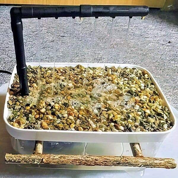 - Aquarienkies auf dem Deckel verteilen oder alternativ eine Antirutschmatte verwenden (siehe Vogeldusche Lite)