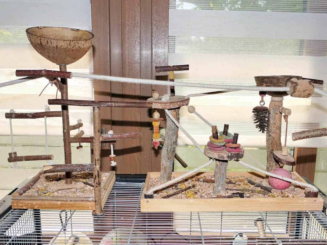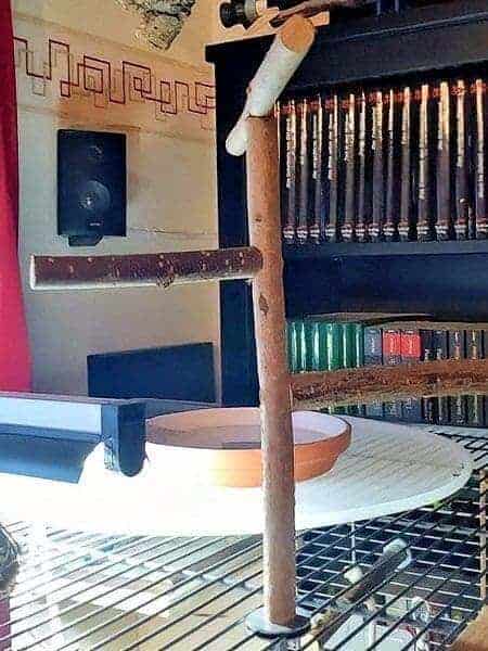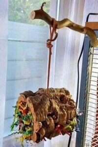 An der hinteren rechten Käfigseite – idealerweise an der Fensterseite – kann eine Sitzstange aus Korkenzieherhasel als „Aussichtsplattform“ dienen. Hier haben die Wellensittiche einen guten Überblick und können entspannt sitzen. Man kann die Stange auch noch mit einem selbst gebastelten Spielzeug kombinieren, wie zum Beispiel einer Korkröhre mit ZigZag-Papier.