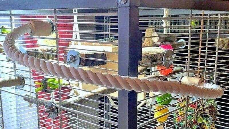 Ein Baumwoll-Sitzseil, das um die Käfigecke geführt wird, ermöglicht den Wellensittichen, bequem von der Vorderseite zur Seite oder sogar auf das Käfigdach zu gelangen. Besonders für Vögel, denen das Klettern um Ecken oder auf das Dach aufgrund des Käfigrahmens schwerfällt, ist das Sitzseil eine beliebte Hilfe.