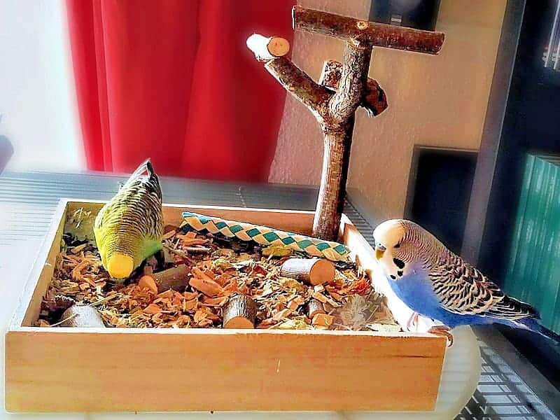 Auf dem Käfigdach bleibt meist noch genug Platz für eine Wühlkiste. Fülle diese mit geeignetem Material, um den natürlichen Erkundungs- und Beschäftigungsdrang der Wellensittiche zu fördern. Bastelanleitungen und Ideen zur Befüllung findest du im Bereich „Selbermachen“.